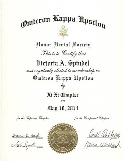 Dr. Victoria Spindel Rubin was awarded a membership in the Omicron Kappa Upsilon dental honor society.